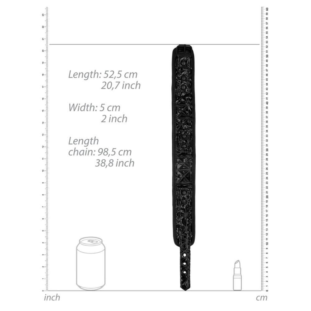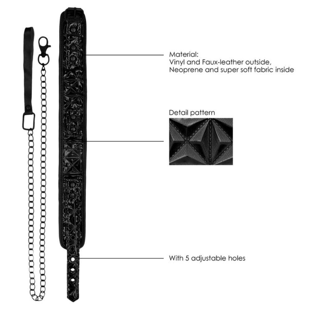 The robust black chain leash attaches with a lobster clasp to the secured O-ring on the collar and combines with a comfortable handle.